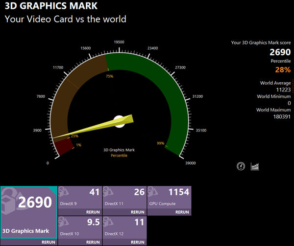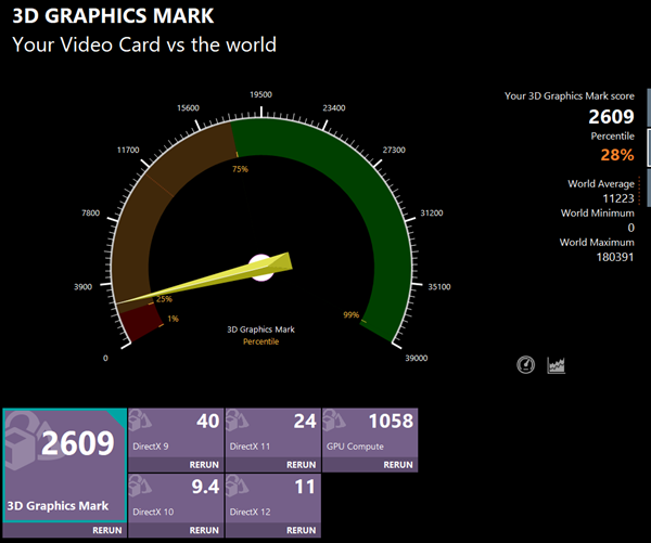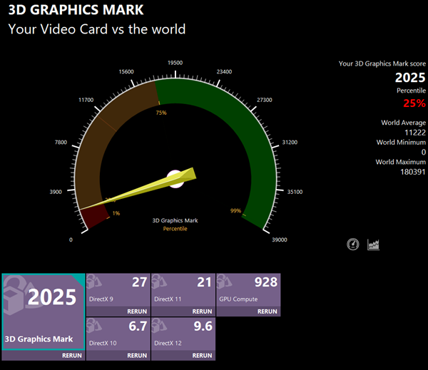3D Graphics Markです。左から「メモリ8GB/バランスモード」は2025、「メモリ24GB/バランスモード」は2609、「メモリ24GB/パフォーマンスモード」は2690でした。悪く無いスコアで、普通です。