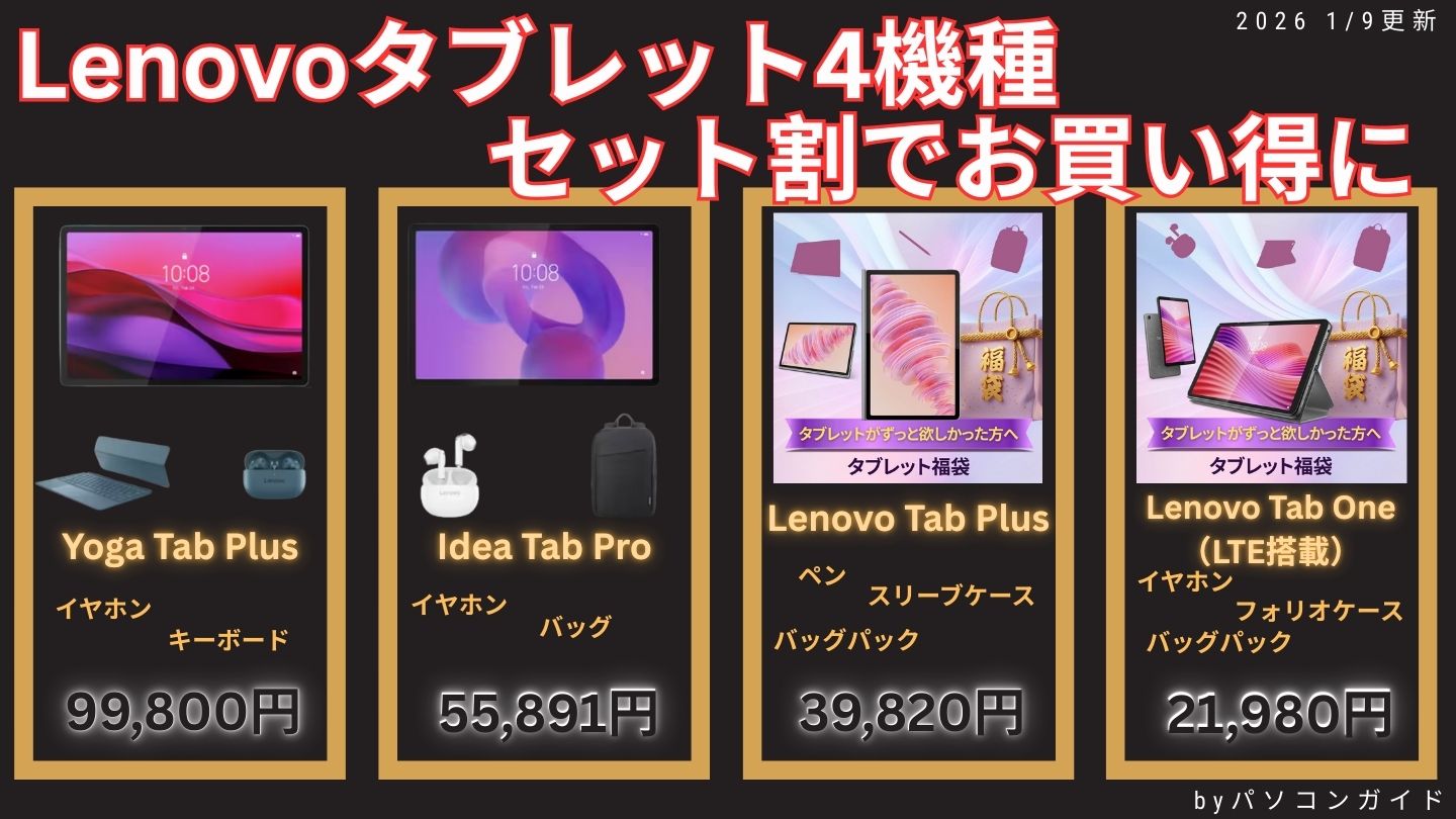 Lenovoは1月15日まで年末年始セールを開催中で、PCや周辺機器が割引中です。タブレットは1/15までの福袋や、期間が記載されていませんがいくつかの機種が割引になっているのでご紹介します。