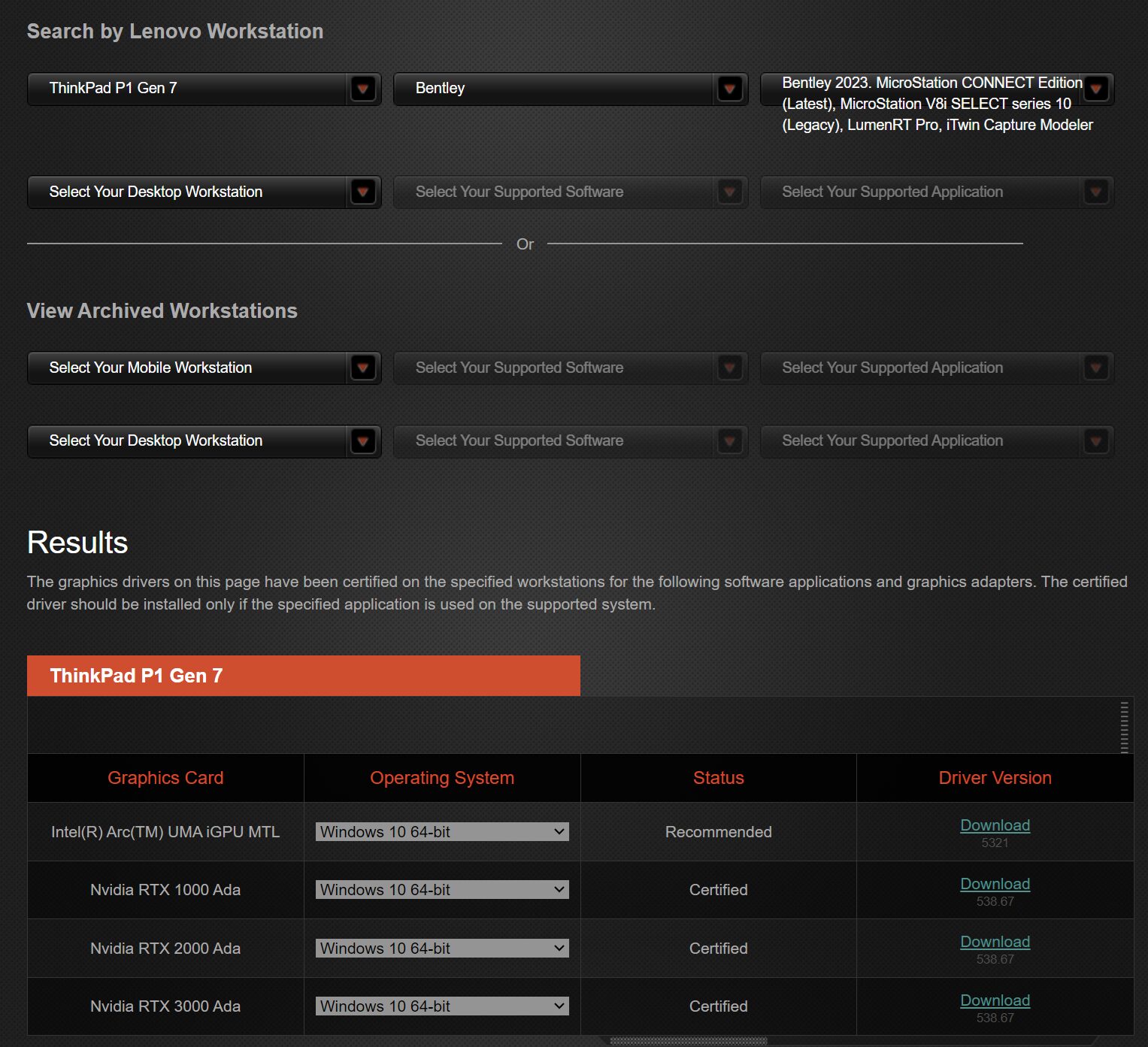 上の画像は「Bentley 2023 MicroStation Connect Edition」の認証を確認した画像で、iGPU時はRecommended、eGPU時はCertifiedとなっています。