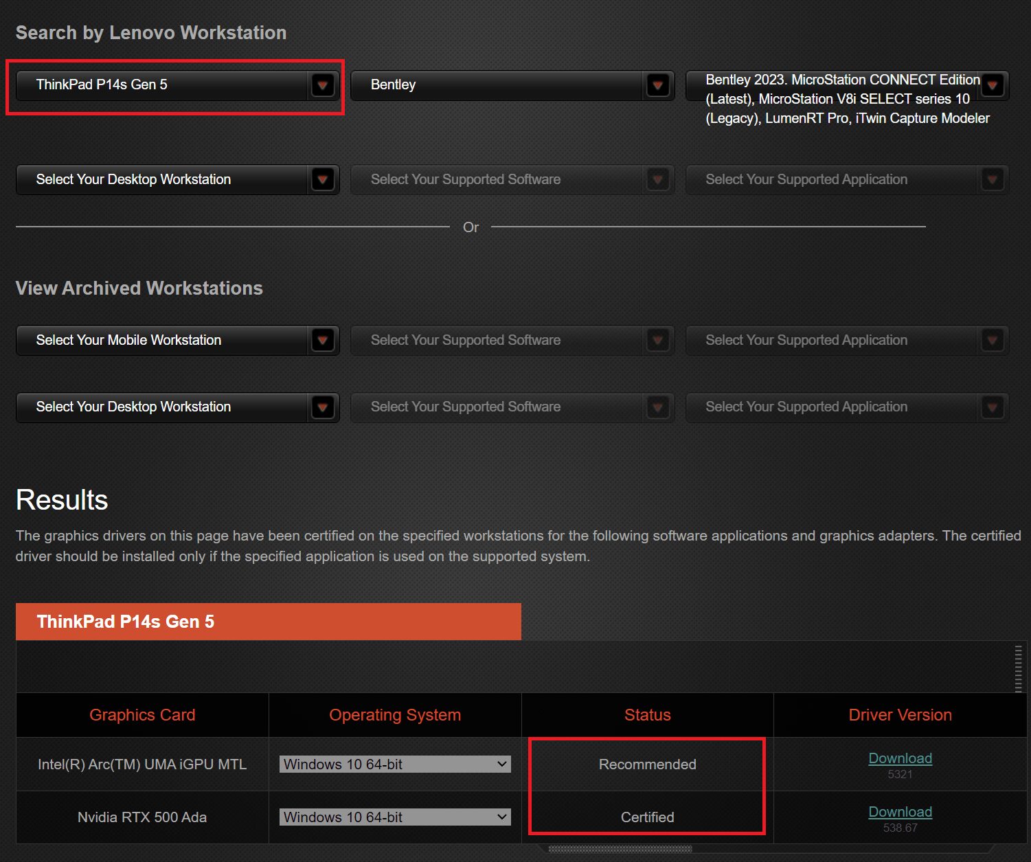 上の画像は「Bentley 2023 MicroStation Connect Edition」の認証を確認した画像で、iGPU時はRecommended、eGPU時はCertifiedとなっています。
