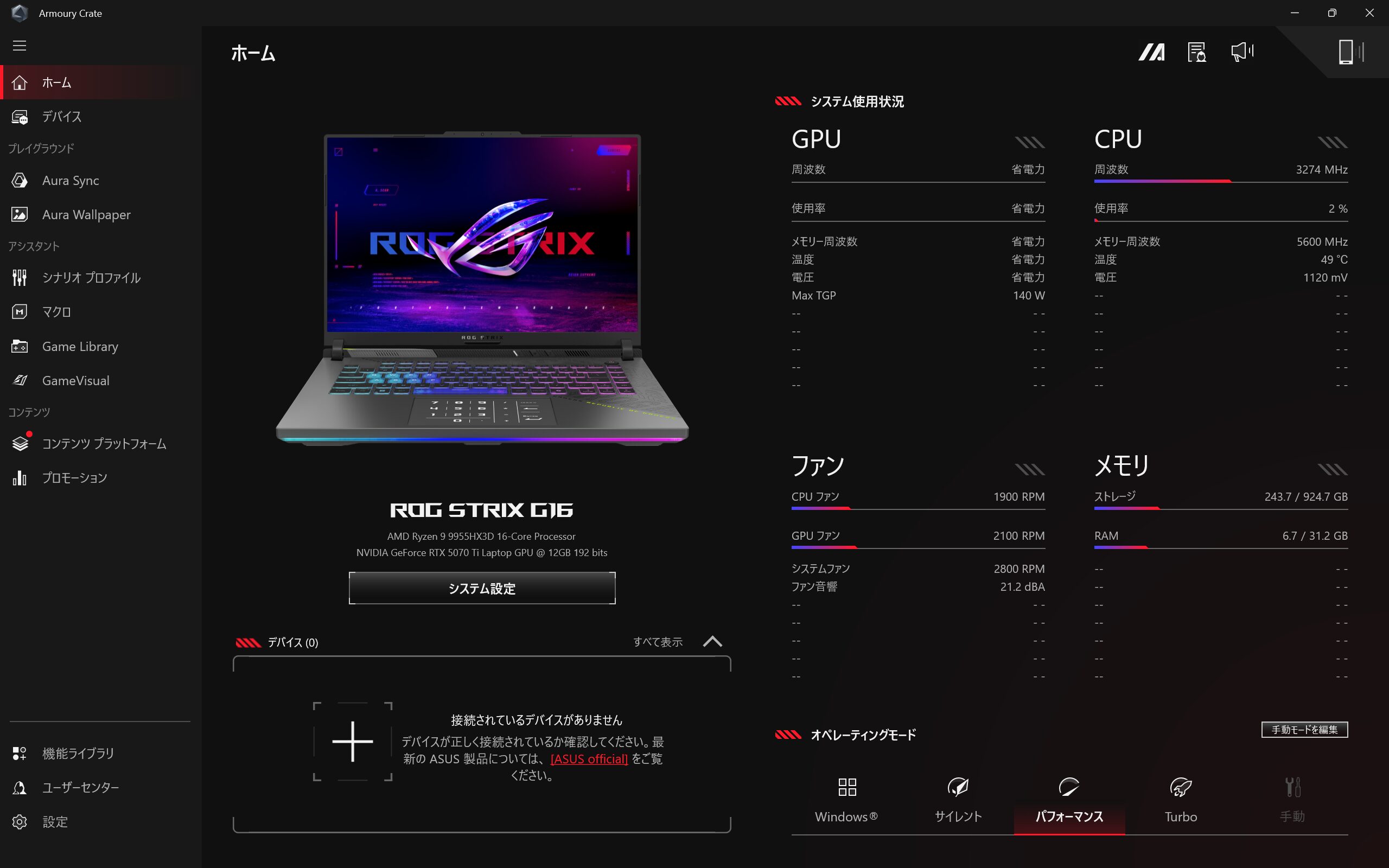 Armoury Crateでは、CPUやGPUなどの設定からライティングにゲームの管理など様々な設定ができます。先述しました「手動モード」でCPU75W+GPU140Wにするのも個々からできます。