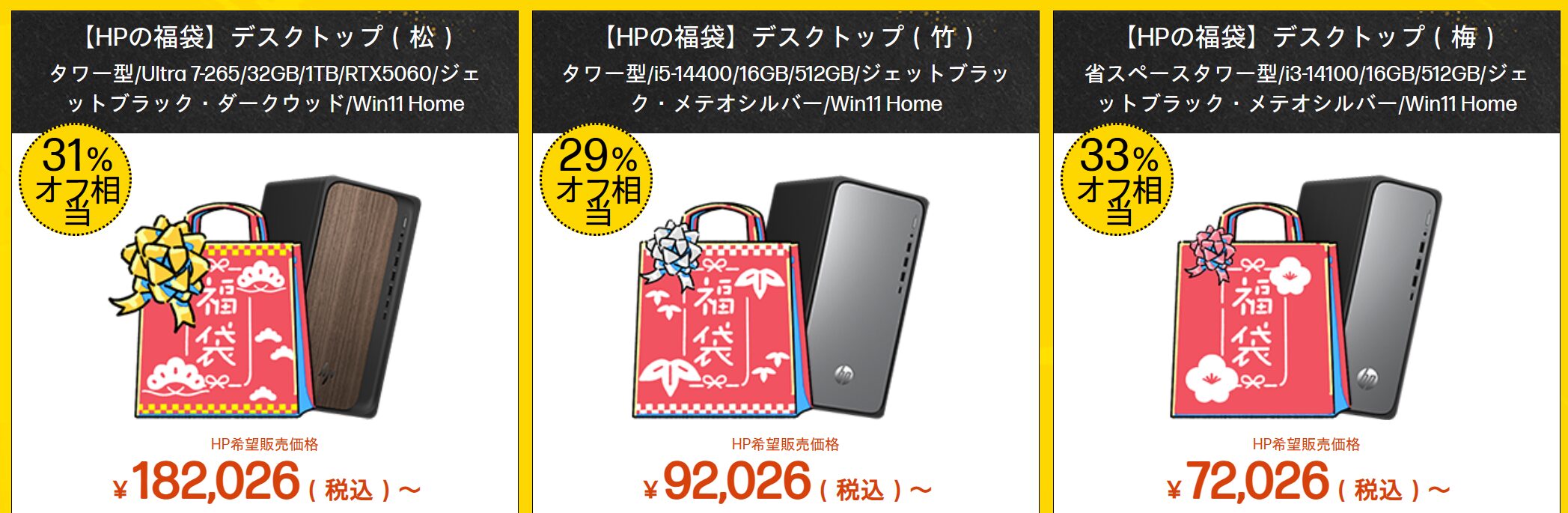 HPでは1/13(火)12:59まで年末大感謝祭SALEを開催中で、デスクトップは最大31%オフになっていますが、福袋に関しては最大33%オフ相当となっています。