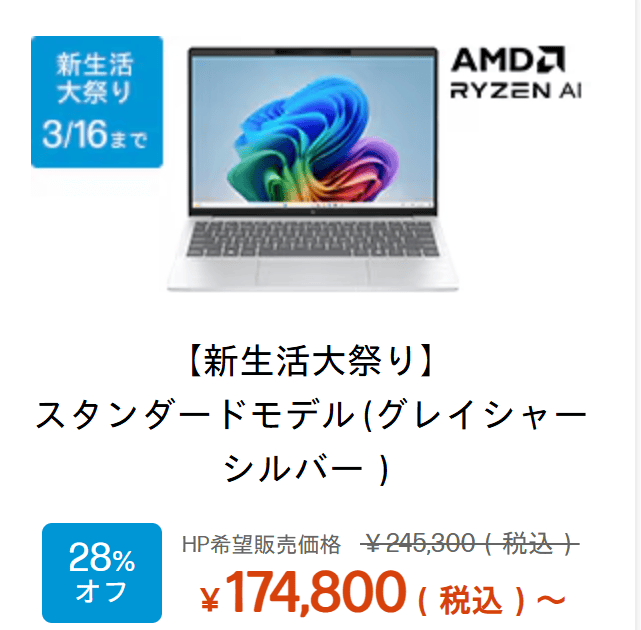 HPは金曜から3月16日月曜の12:59までの4日間と長めの週末セールを開催中で、OmniBook 7 Aero 13-bgが13.9万円まで値下がり中です。