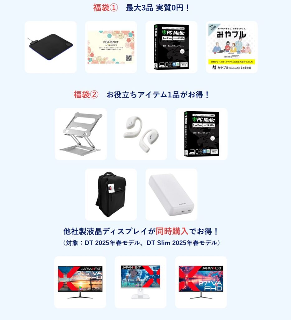 福袋特典は、最大3品のアイテムが実質0円、バッグやスタンドなどお役立ちアイテムが1品お得に購入できる、そしてJAPANNEXTのモニターが同時購入でお得に買える、です。(今回のセールではLavie Direct DTと