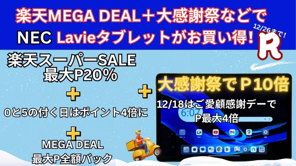 - 12/26まで楽天MEGA DEAL+大感謝祭でLavieタブレットが安い!